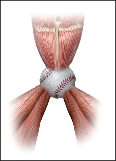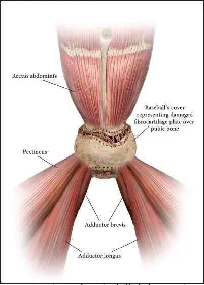 This is one of our favorite images to share with our clients. We ask them to imagine the whole pubic bone like a baseball with a firm, compressible leather cover. Symmetrically, all the core muscles cross by or attach to this baseball. The rectus abdominis attaches from above, and the adductors attach from below – all joining into this hard surface (pubic bone) with a soft cover. The baseball cover represents the fibrocartilage plate that attaches to the pubic bone. If that cover begins to loosen because of asymmetrical pulling from muscles above and below, there is a danger that it will separate from the pubic bone and be pulled off. This loosening leads to inflammation, pain, and a continuum of core injury that includes osteitis pubis.